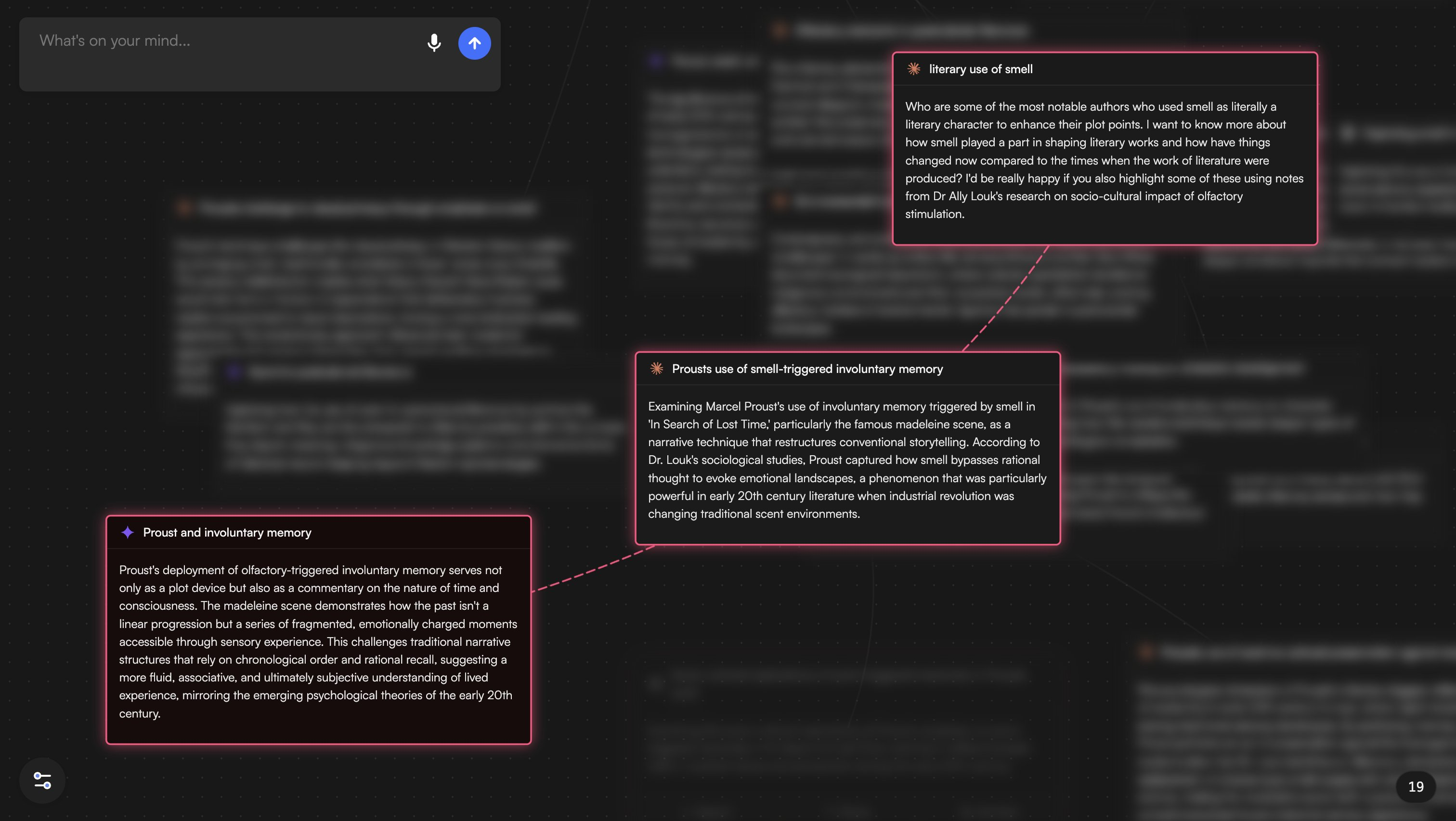 After ChatGPT came out, technology circles erupted with the debate on whether a chat is the best interface to become the anvil of shaping the thoughts of an LLM. Part of the discourse was because chat is sort of a power steering for structuring indeterministic outs, and part was whether is a correct representation on how we explore our thoughts. As humans, we don’t think in a linear fashion, we go in different directions and then we go off in some more branches until probably some of the branches interwine and converge back with the main root, creating the seemingly perfect thought that makes things condense to a circle.